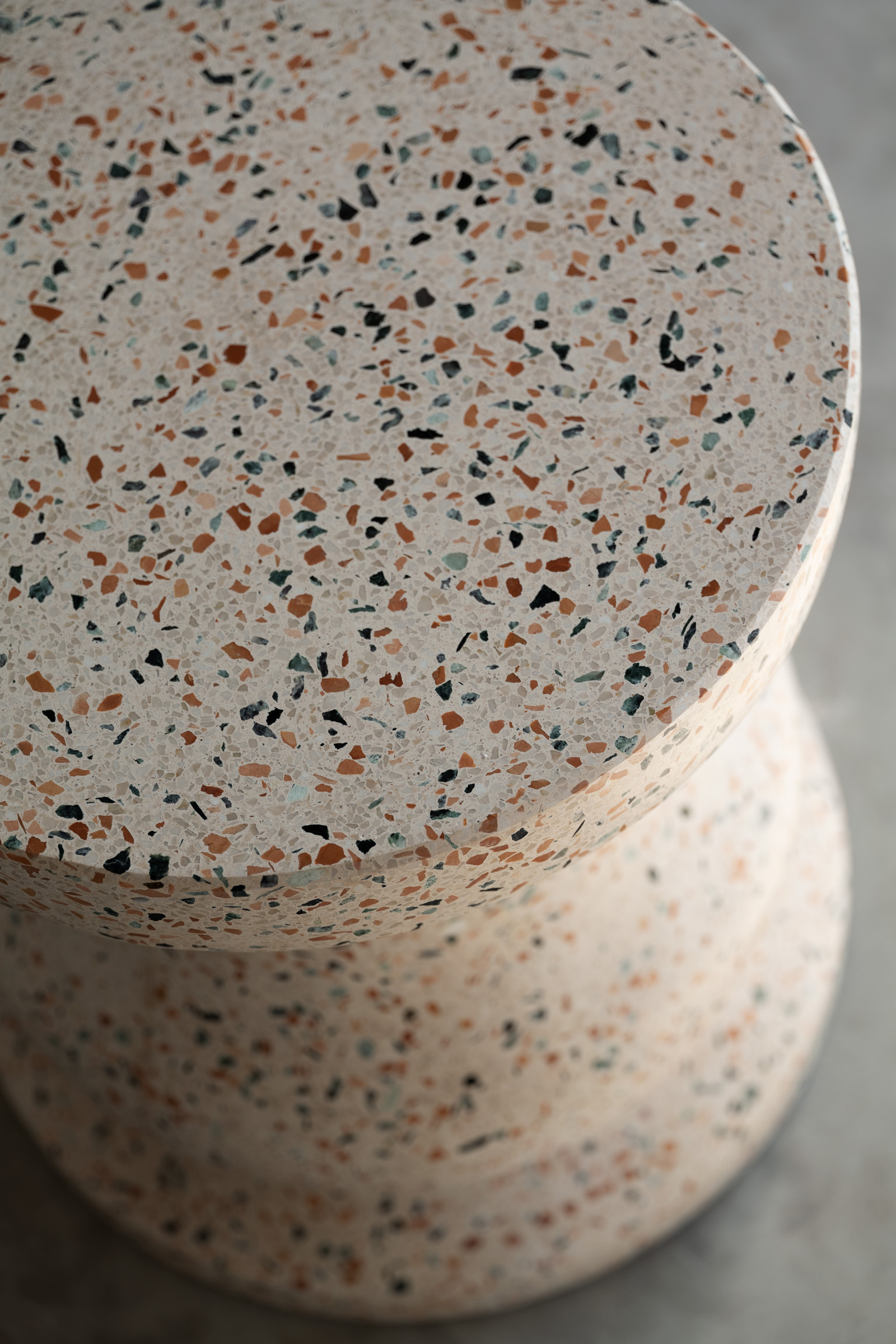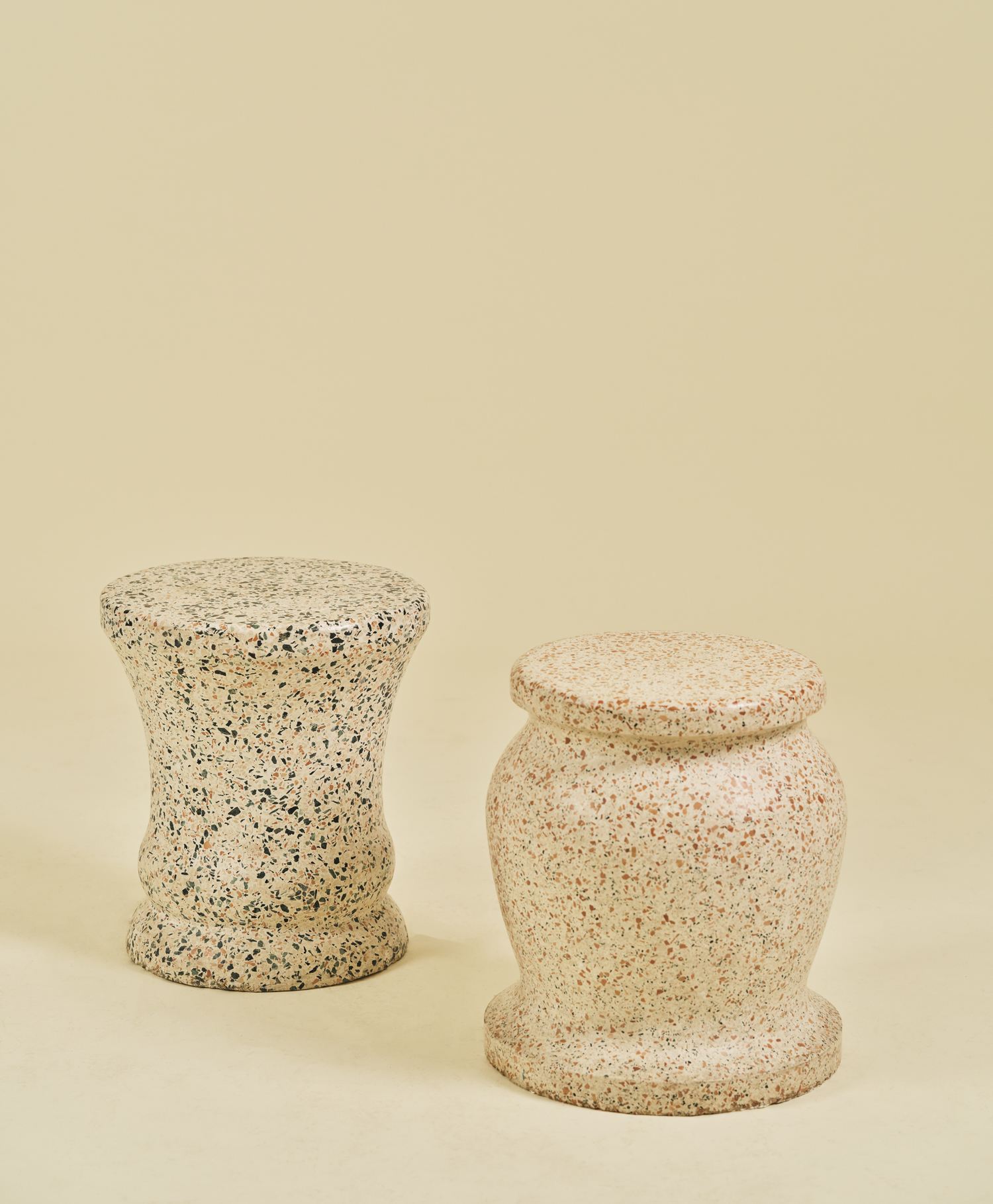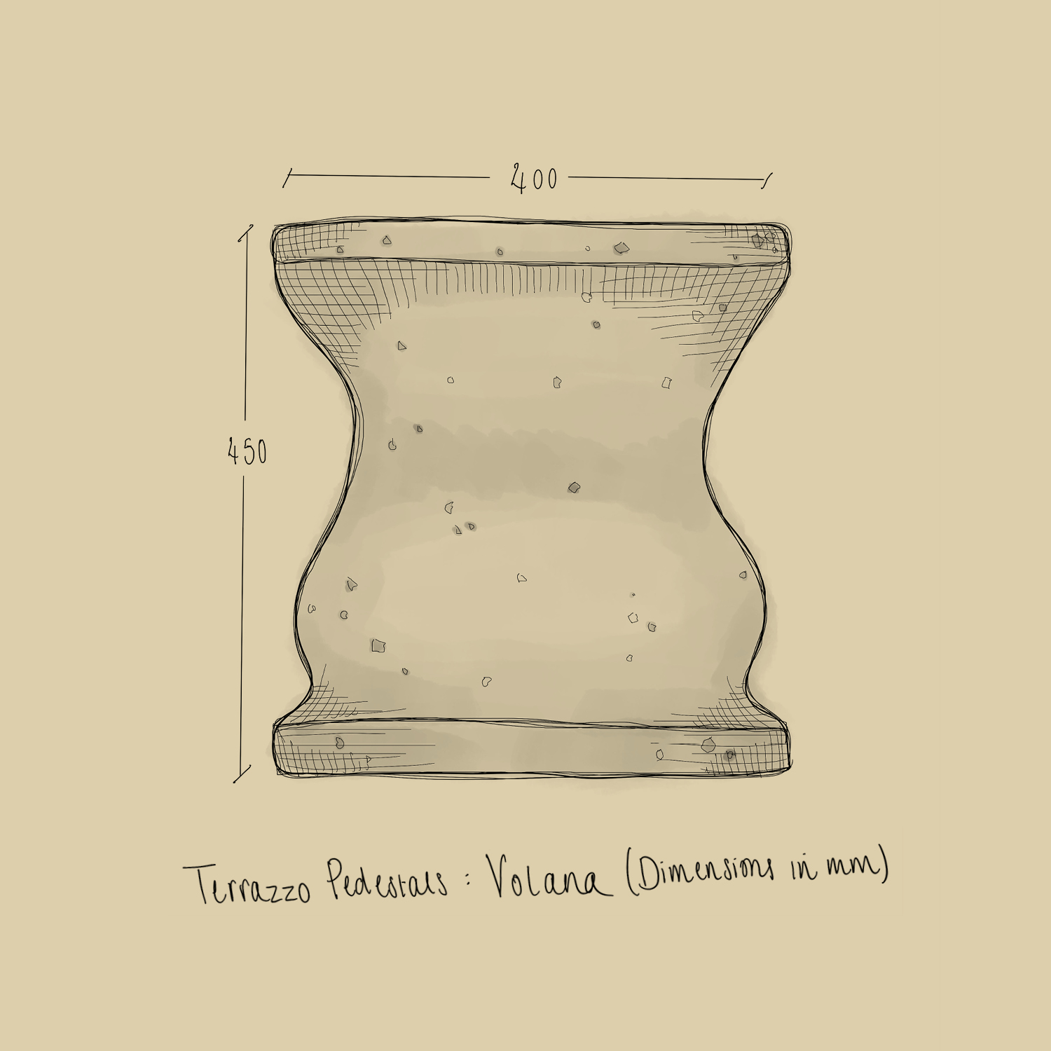 Unquestionably solid yet invitingly sensual, the sculptural forms of these vast terrazzo pedestals were derived from the worn, carved stone elements of classical architecture. To poetically subvert the original forms and materials, we reconstructed three imaginary pieces in cast terrazzo, with deliberately softened edges to evoke the passage of time. We chose terrazzo for its fluidity and inherently recycled nature, blending leftover raw marble and stone fragments from the quarrying process into a humble, composite material. Robust and simple in form, yet hinting at tradition. Originally designed for exterior use, these are equally as elegant indoors, and can be used as a stool, table or pedestal.