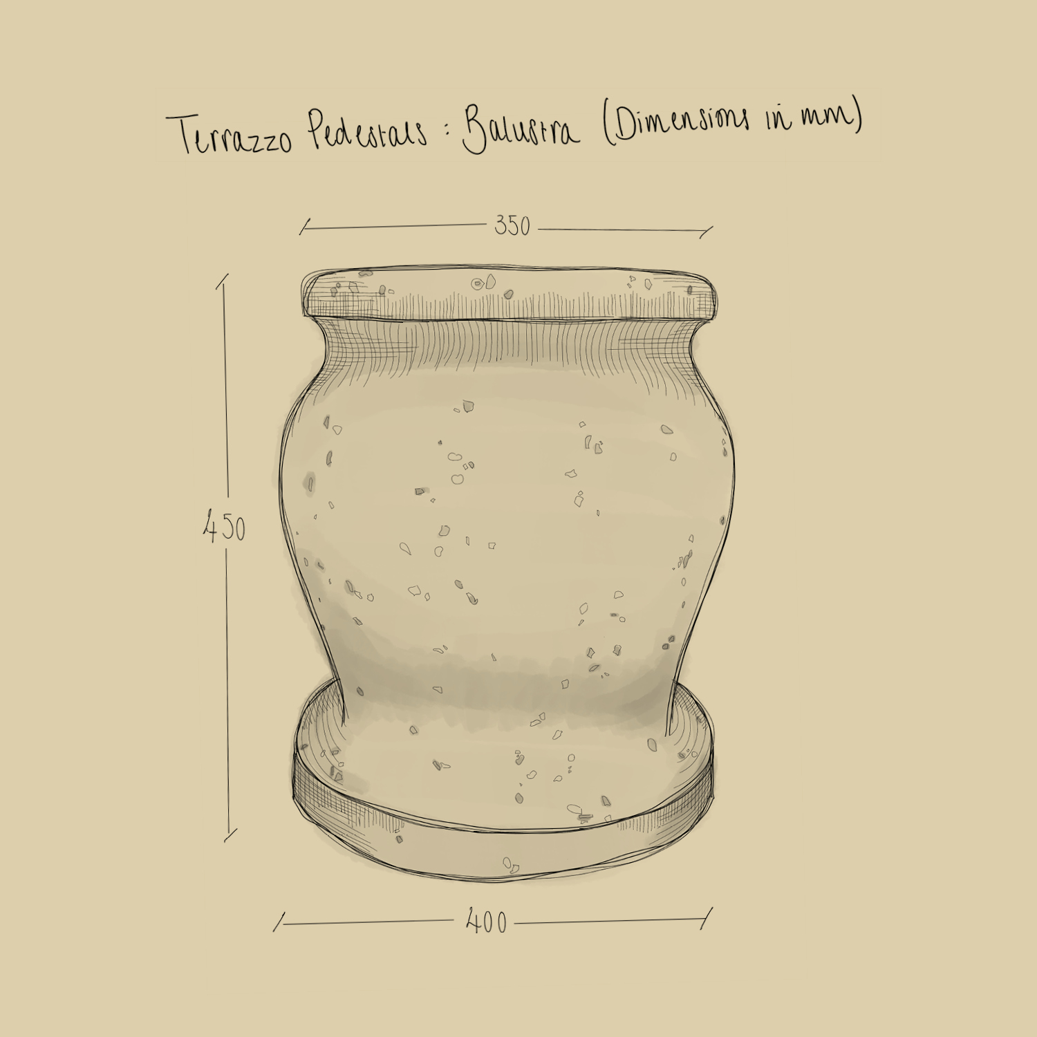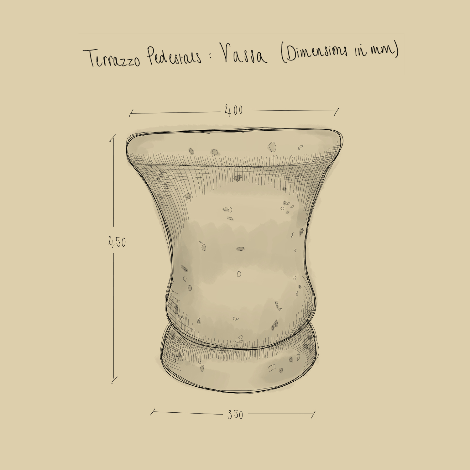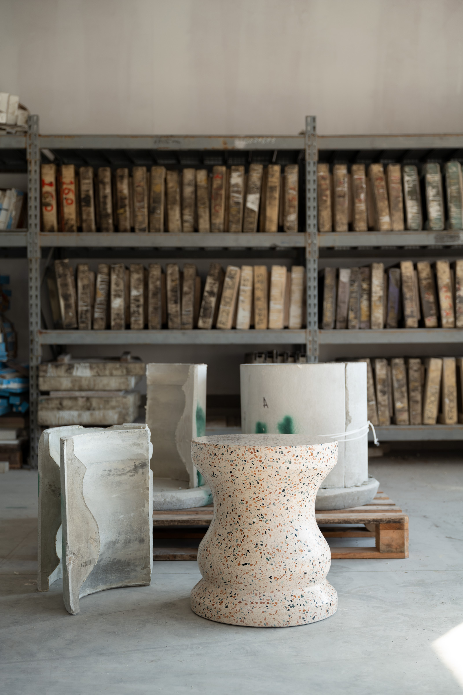 Unquestionably solid yet invitingly sensual, the sculptural forms of these vast terrazzo pedestals were derived from the worn, carved stone elements of classical architecture. To poetically subvert the original forms and materials, we reconstructed three imaginary pieces in cast terrazzo, with deliberately softened edges to evoke the passage of time. We chose terrazzo for its fluidity and inherently recycled nature, blending leftover raw marble and stone fragments from the quarrying process into a humble, composite material. Robust and simple in form, yet hinting at tradition. Originally designed for exterior use, these are equally as elegant indoors, and can be used as a stool, table or pedestal.