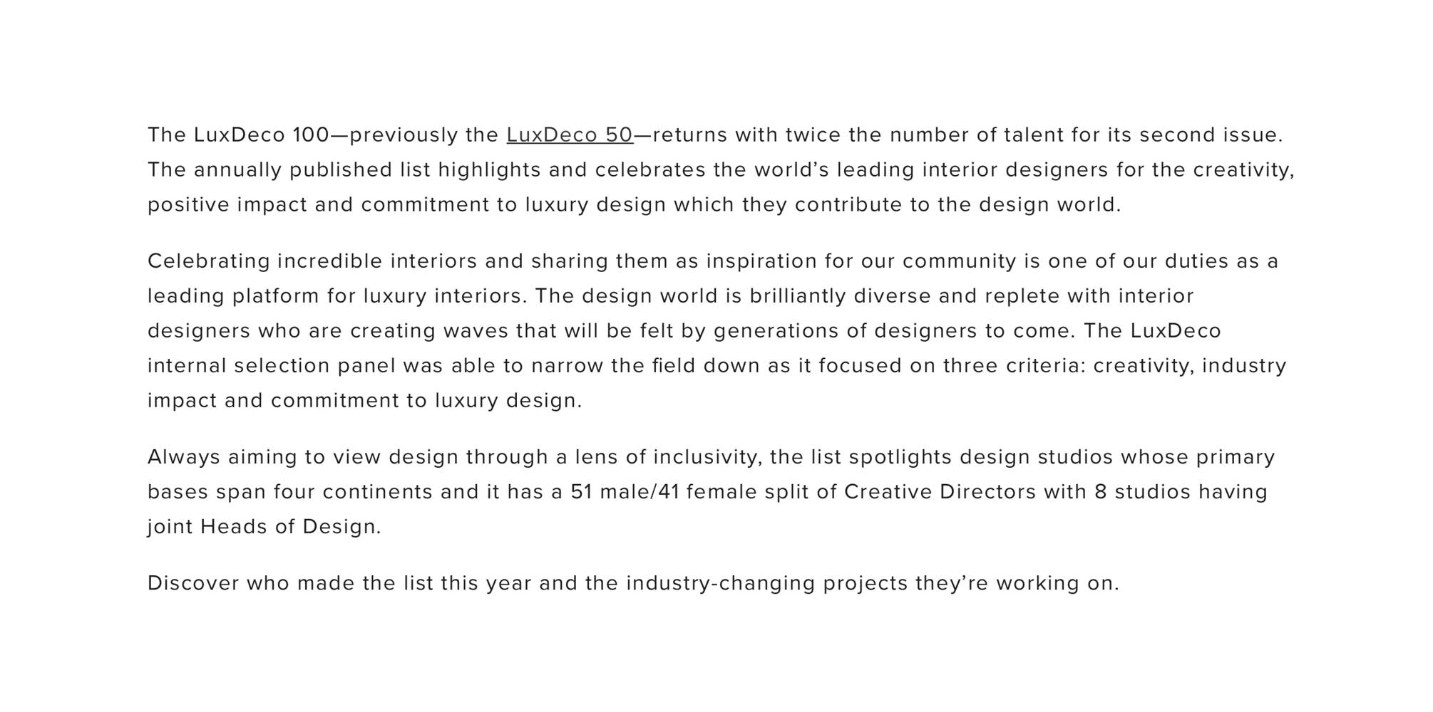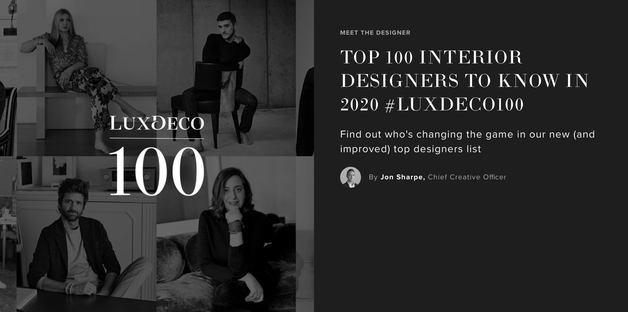 LuxDeco Top 100 Interior Designers to Know in 2020, April 2020.