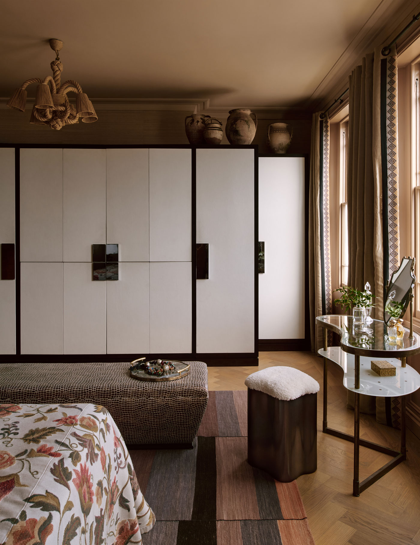 The second floor houses the main bedroom which has an earthy and rich tone which calms the space and features an Italian dressing table from Fiona McDonald has been paired with a ‘Lily’ stool from Tom Faulkner.