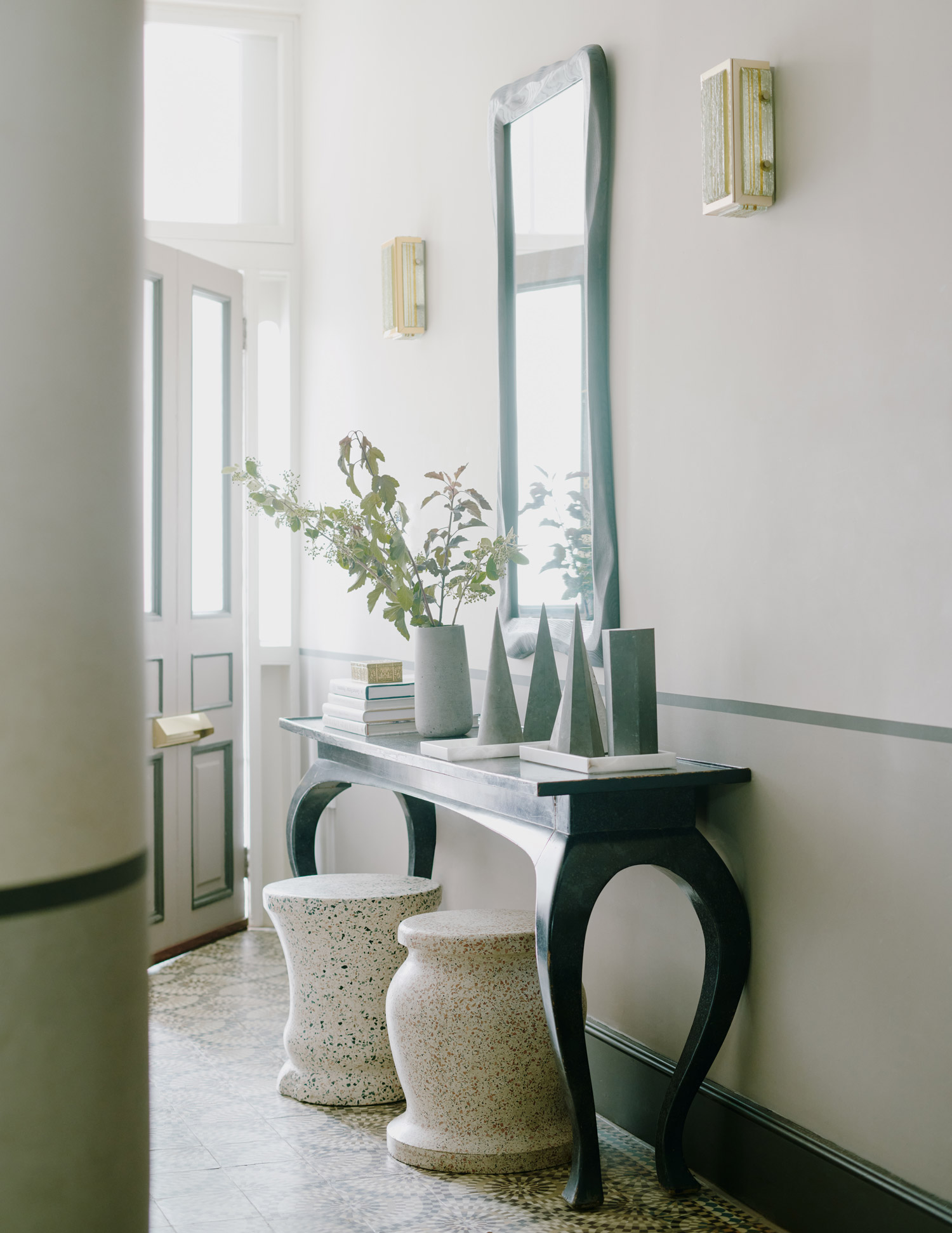 There is a harmonious balance to the house. It is elegant and playful, and we pushed the boundaries but not at the expense of it being liveable. We wanted to create a multi-layered, stimulating sensory experience for our clients. We explored materials, colour and form and juxtaposed these with contemporary and vintage finishes.