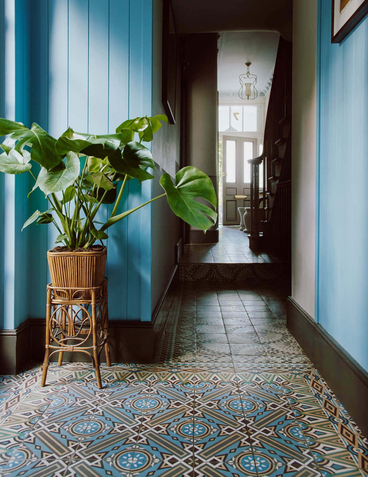 The hall and open plan kitchen and dining room are tiled in a busy colourful pattern and palette.